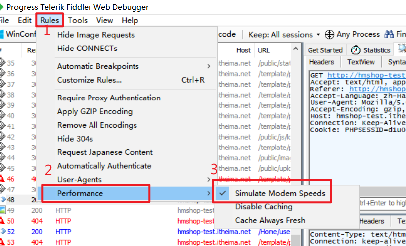 第二步:开启网络延迟: Rules—Performance—Simulate Modem Speeds