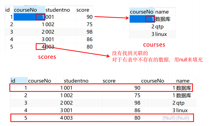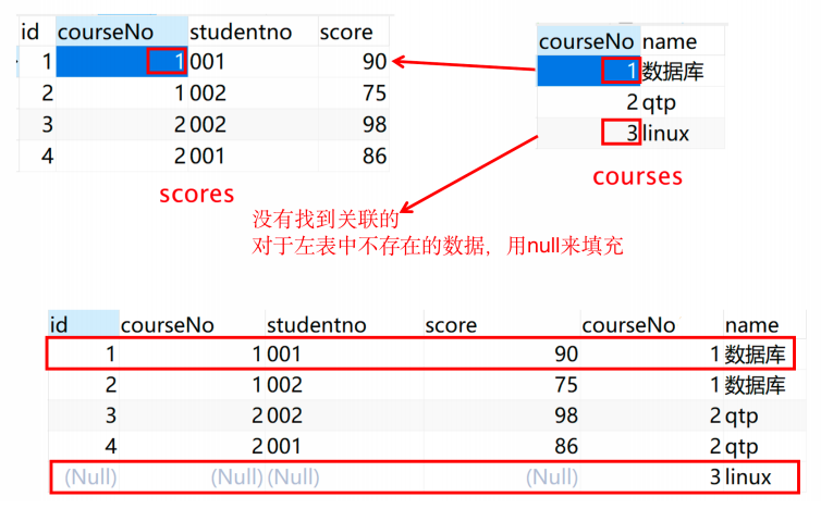 left join: 连接两个表时,取的是左表中特有的数据,对于右表中不存在的数据,用null来填充。