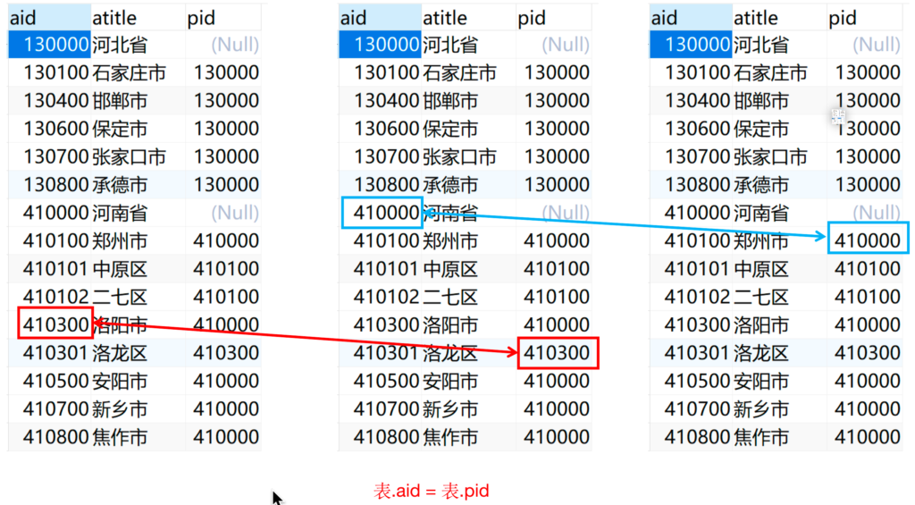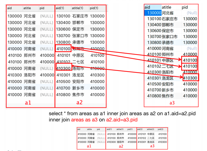 Select * from areas as a1 inner join areas as a2 on a1.aid=a2.pid inner join areas as a3 on a2.aid=a3.pid where a1.atitle='河南省'