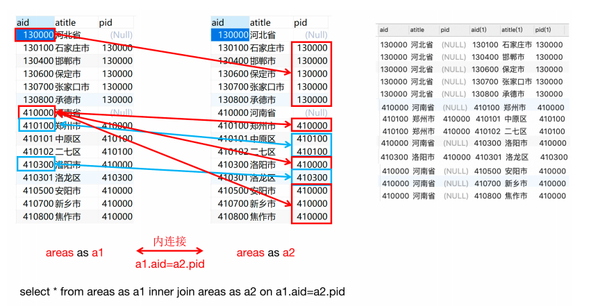 Select * from areas as a1 inner join areas as a2 on a1.aid=a2.pid where a1.atitle='河南省';