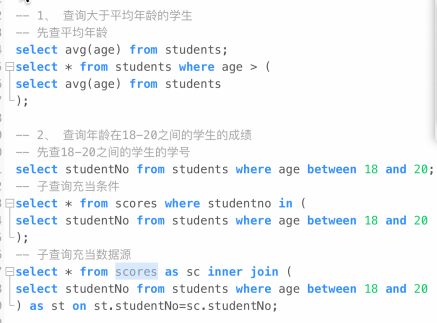 - 将一条SQL查询的语句嵌入在其他的SQL语句中,被嵌入的SQL语句称之为子查询,其他的SQL称之为主查询