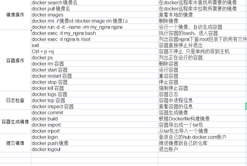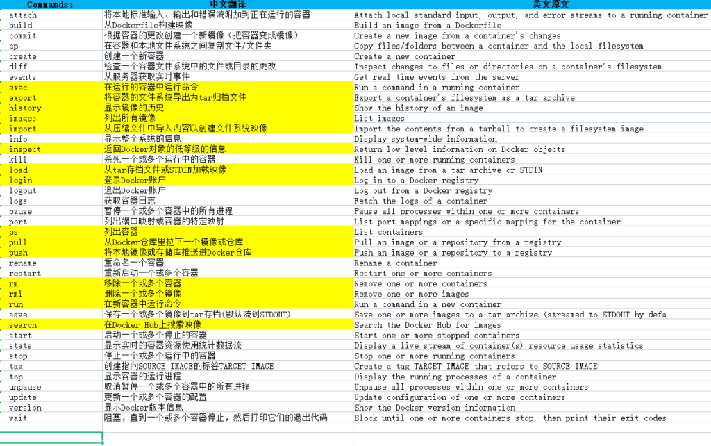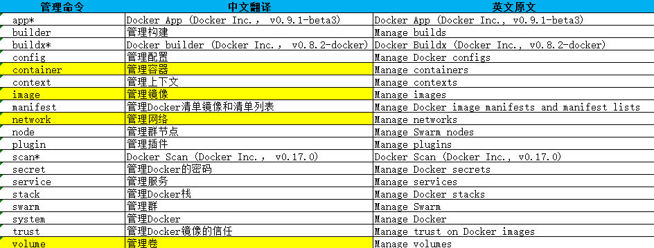 docker 直接查看所有命令。基本有以下命令,分管理命令和直接执行命令。例如使用 docker image –help可以查看管理image镜像命令下的具体操作。