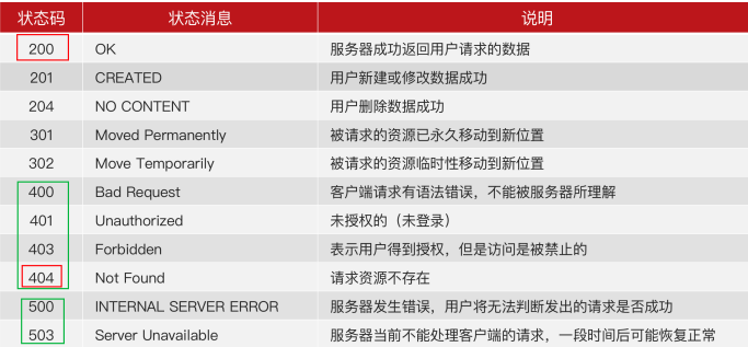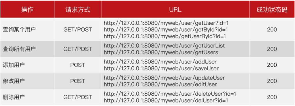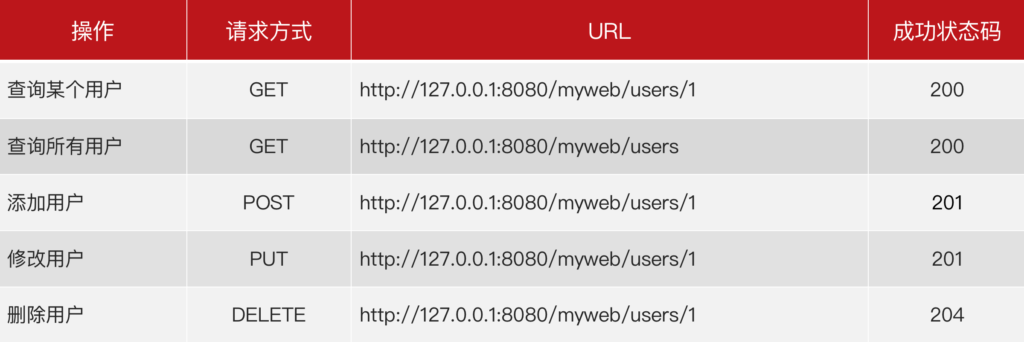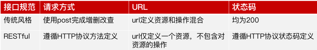 - 接⼝使⽤的⽅法,与 http协议的 请求⽅法,⼀⼀对应。