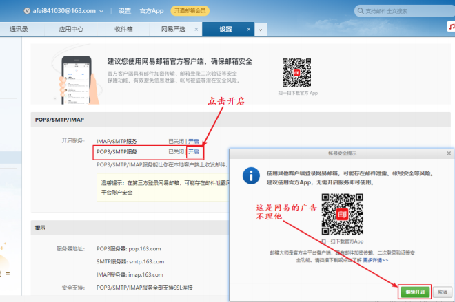 2.点击 “POP3/SMTP服务” 后⾯的 “开启” , 会弹出⻚⾯,是个⼴告,不理它。 点 “继续开启