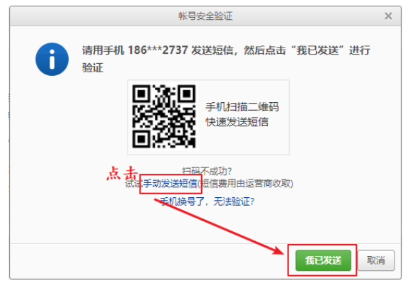 3.扫码 或者 ⼿动,按要求发送短信给 ⽹易进⾏验证。确认短信发送成功。点击 “我已发送”