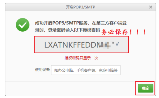4. 会 弹出对话框,显示 开始 POP3/SMTP 服务 相应的授权码。务必保存此授权码!,然后点确定。