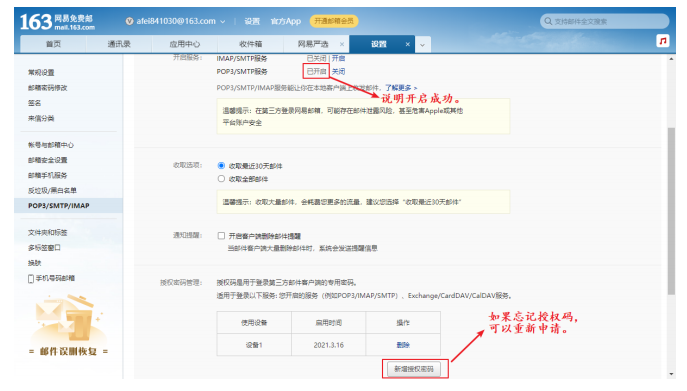 5. 确认开启成功。后期如果授权码忘记了, 可以点 “新增授权密码” 重新申请。