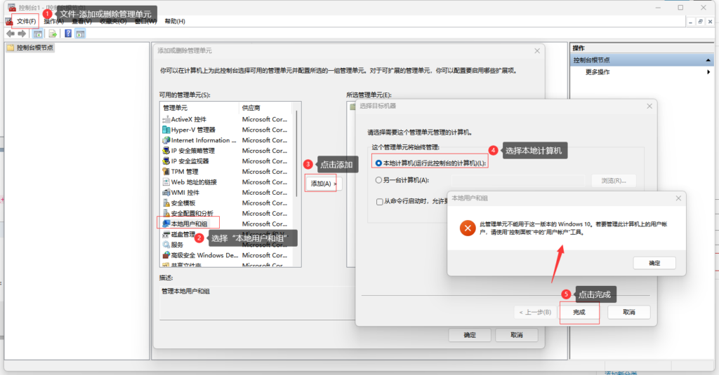 使用win+r启动运行,输入”mmc“打开Microsoft管理控制台,进行添加”本地用户和组“管理单元的操作,无法添加成功。