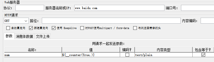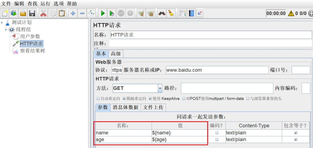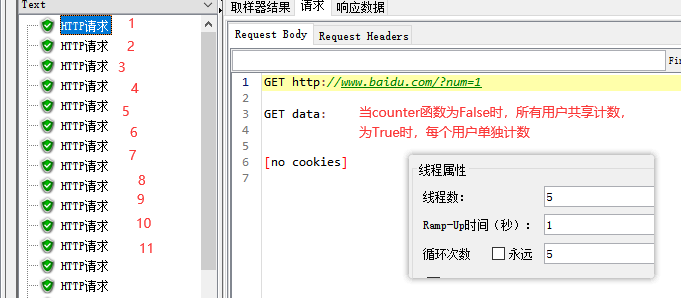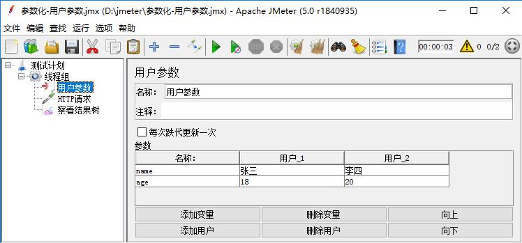 用户参数里设置了两个用户,线程组里添加两个用户线程。如果添加了多个用户,会依次遍历添加的用户参数