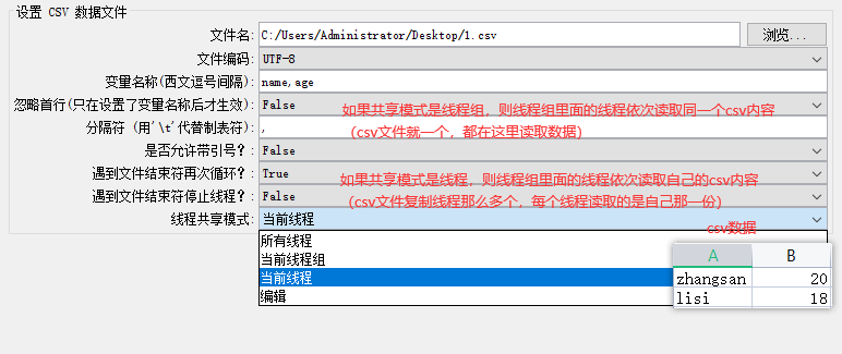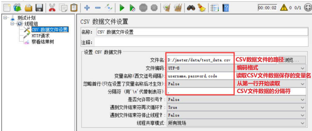 位置:测试计划 –> 线程组–> 配置元件 –> CSV 数据文件设置