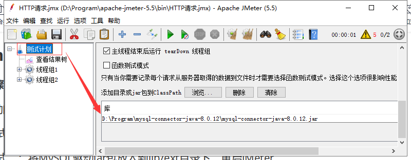 -方式一:在测试计划面板点击“浏览…“按钮,将你的JDBC驱动添加进来