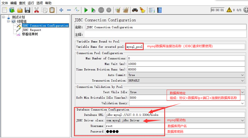 添加方式:测试计划 –> 线程组–> (右键添加) 配置元件 –> JDBC Connection Configuration