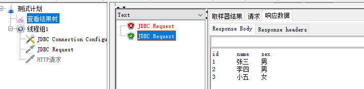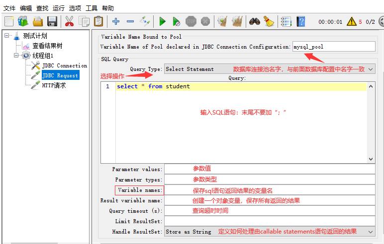 添加方式:测试计划 –> 线程组–> 取样器 –> JDBC Request