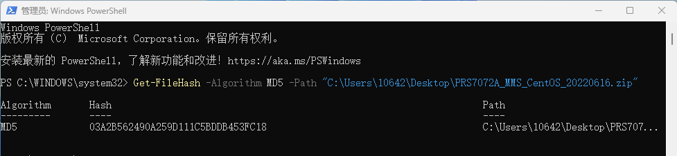Get-FileHash -Algorithm MD5 -Path 文件路径