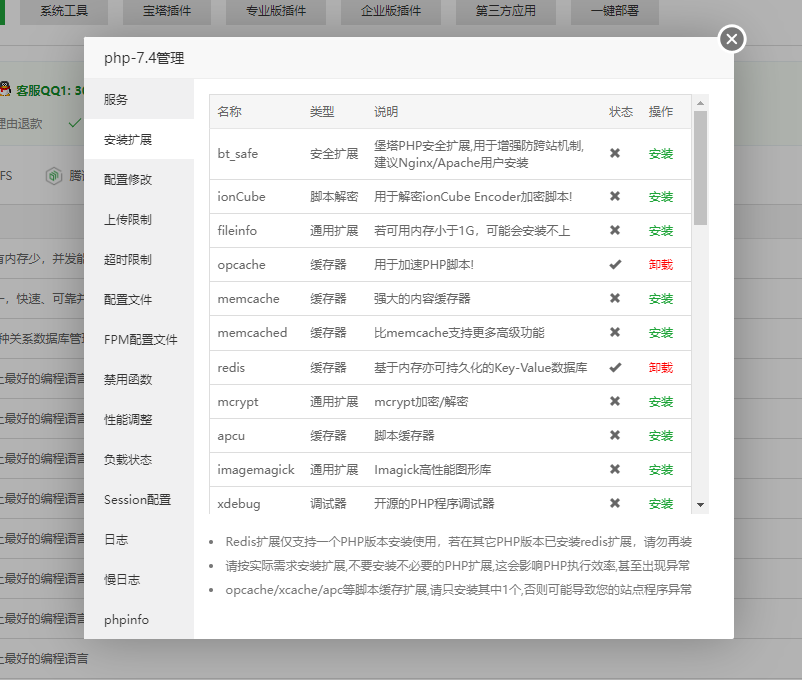 1、宝塔为例:进入自己服务器,打开宝塔面板,选择你目前在使用的 PHP 环境版本(推荐 PHP7.4),找到-安装扩展然后找到 Redis 并安装,如下图: