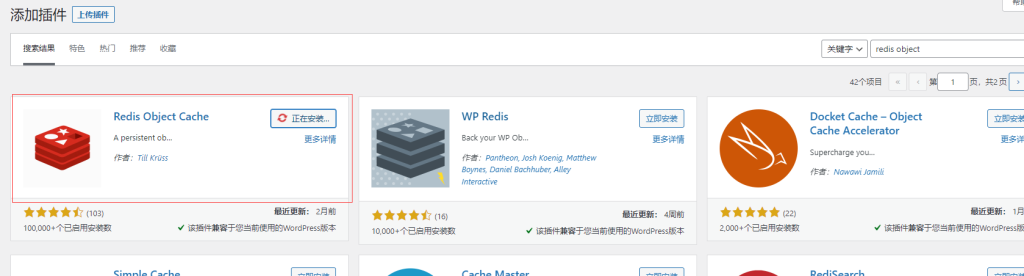 1、进入 wordpress 后台找到插件,安装插件,搜索:Redis Object Cache 如下图: