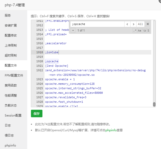 使用宝塔安装 Opcache 之后会自动配置好扩展参数,如需适当修改,进入配置文件,搜索;opcache,即可看到配置参数: