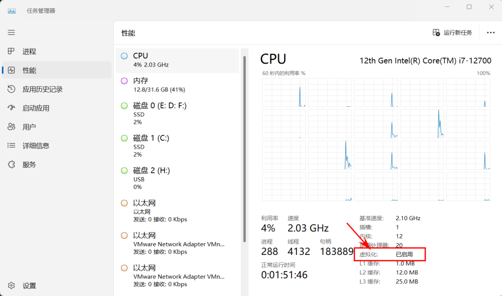 1.【任务管理器】视图查看系统虚拟化功能状态