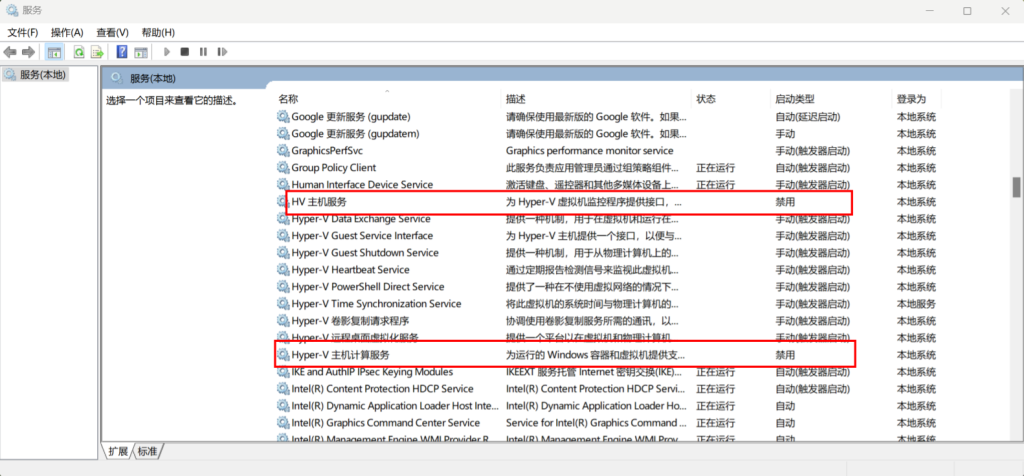 以上还不行的话,只能再干脆一点了。禁用所有虚拟化附加服务。Hyper-v与vmware有冲突的。wsl也是虚拟化的服务,可能也会存在冲突。