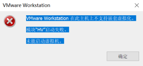 问题2:VMware Workstation 在此主机上不支持嵌套虚拟化。 模块“HV”启动失败。 未能启启动虚拟机