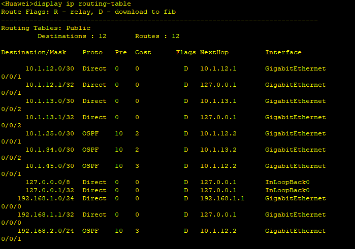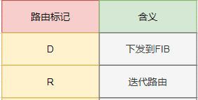 路由标记,R表示该路由是迭代路由。D表示该路由下发到FIB(Forwarding Information Base)表。