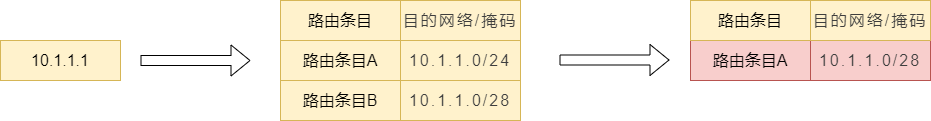 比如:路由器收到一个目的IP地址为10.1.1.1的数据包,此时查找路由表,有两个路由条目,一个路由条目的A的目的网络/掩码是10.1.1.0/24,另一条路由条目B的目的网络/掩码是10.1.1.0/28,那么这个数据包匹配的是哪一个路由条目呢?