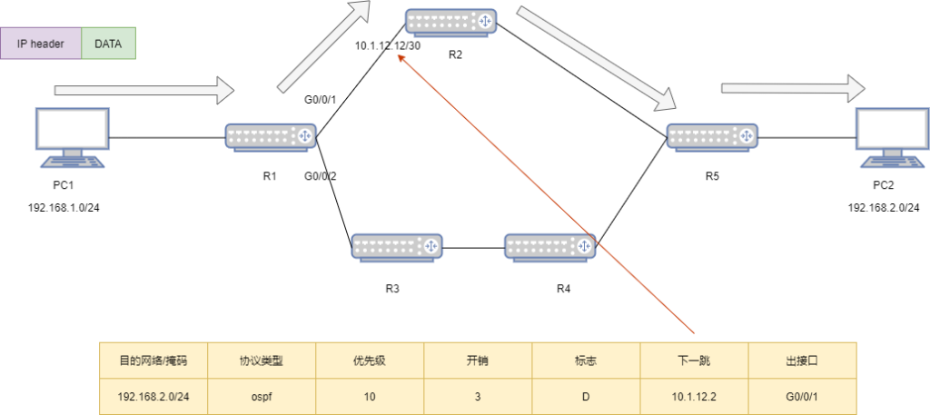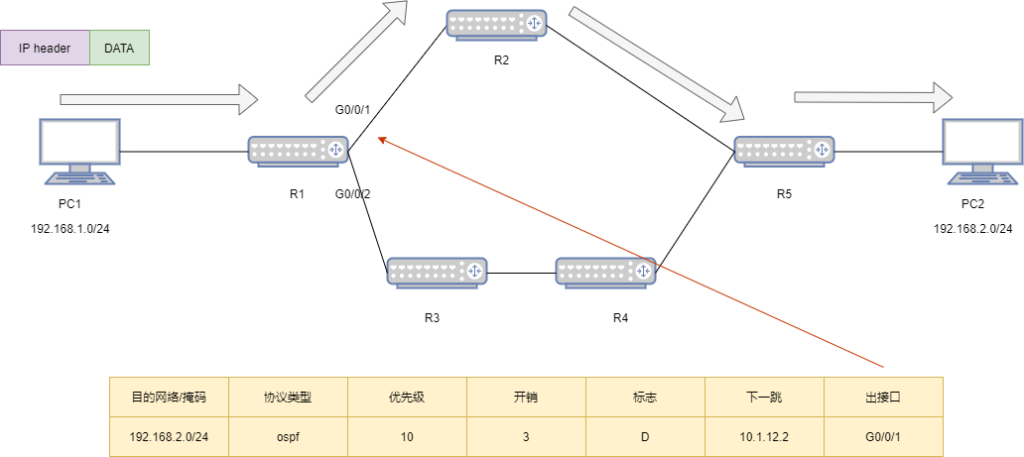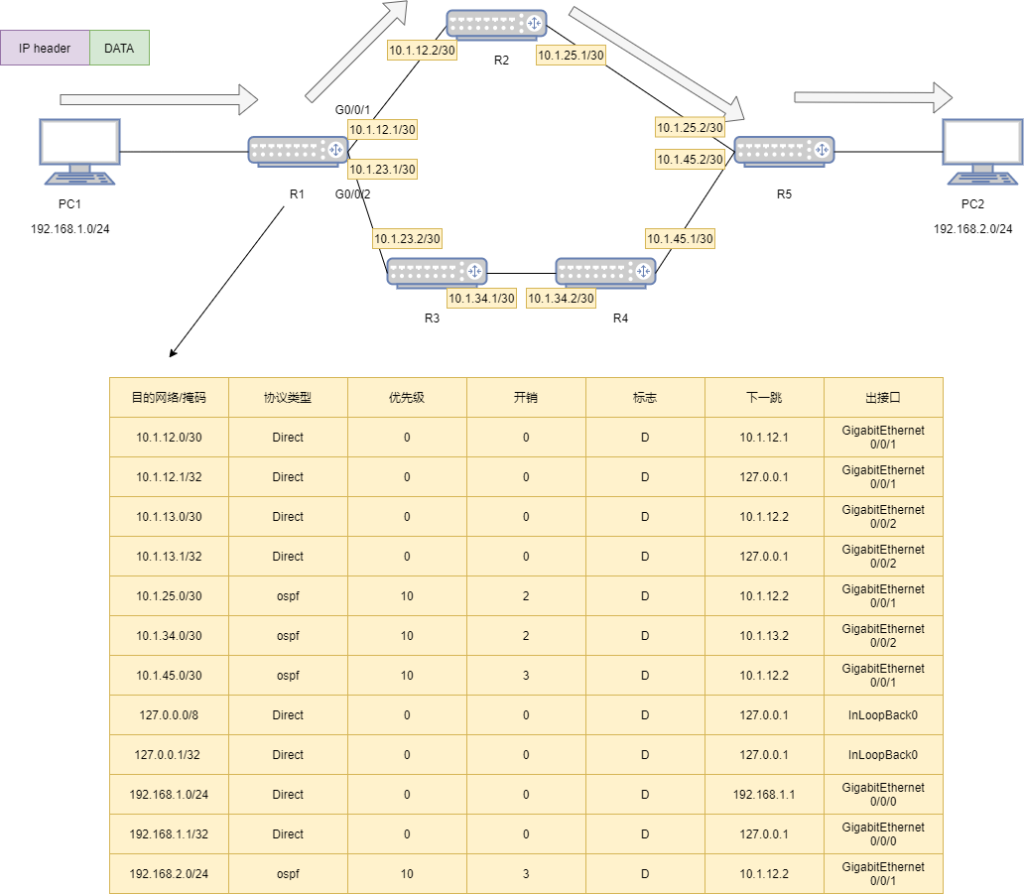 路由表:简单点说路由表就是路由器用于指导数据包如何转发的表项,记录了去往目的IP的下一跳去哪里(如下图)。