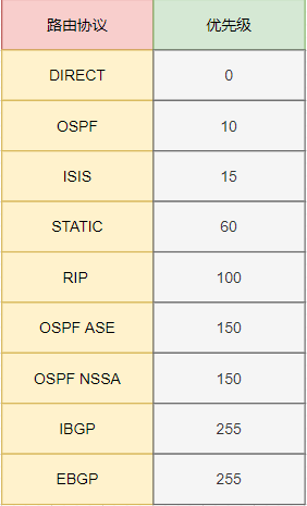 每种协议类型对应不同的优先级,优先级值越小则路由越优。