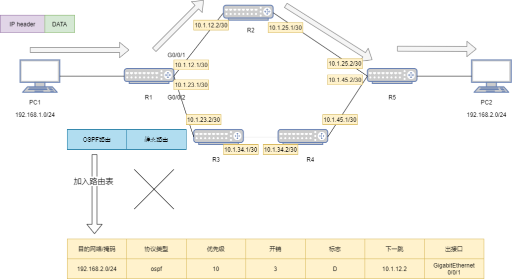 举个例子:去往目的IP为192.168.2.1的通过静态路由生成了,也通过OSPF路由生成了。那么这个时候什么样的路由才会加入到路由表中呢?这个时候就和路由协议的优先级有关系了。