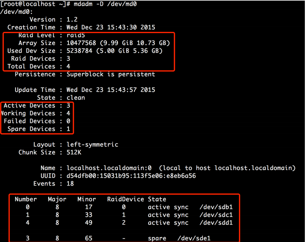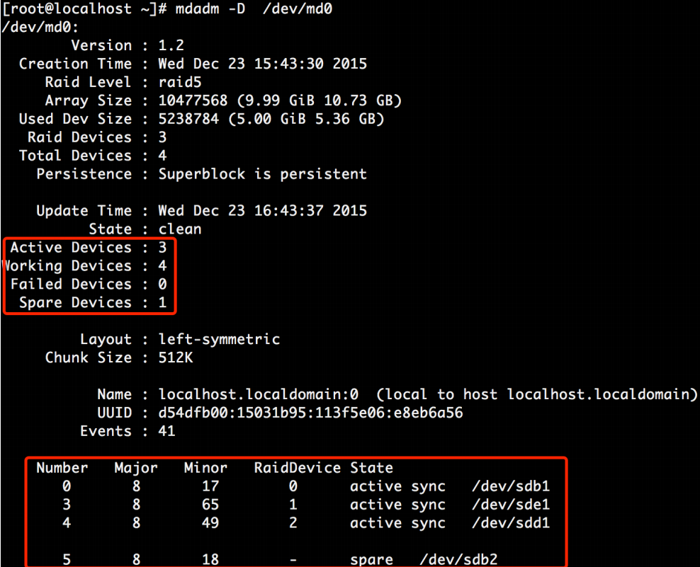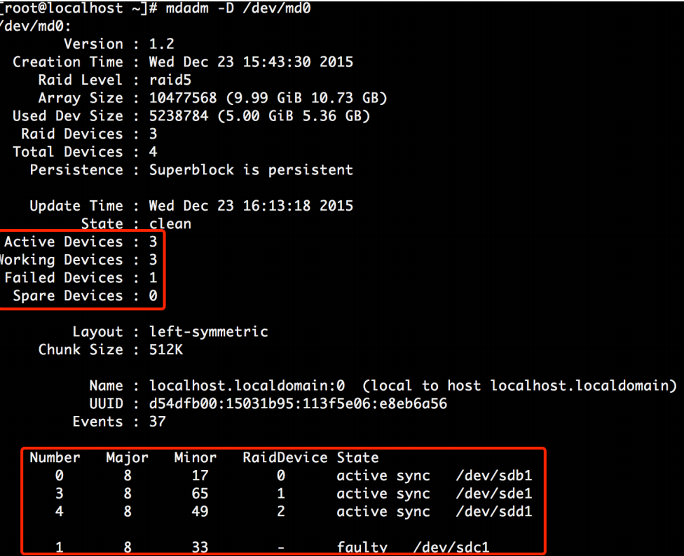 1.现在开始测试冗错,这里先将分区/dev/sdc1 置为失效状态,并且查看热备分区/dev/sde1 是否切换过来。