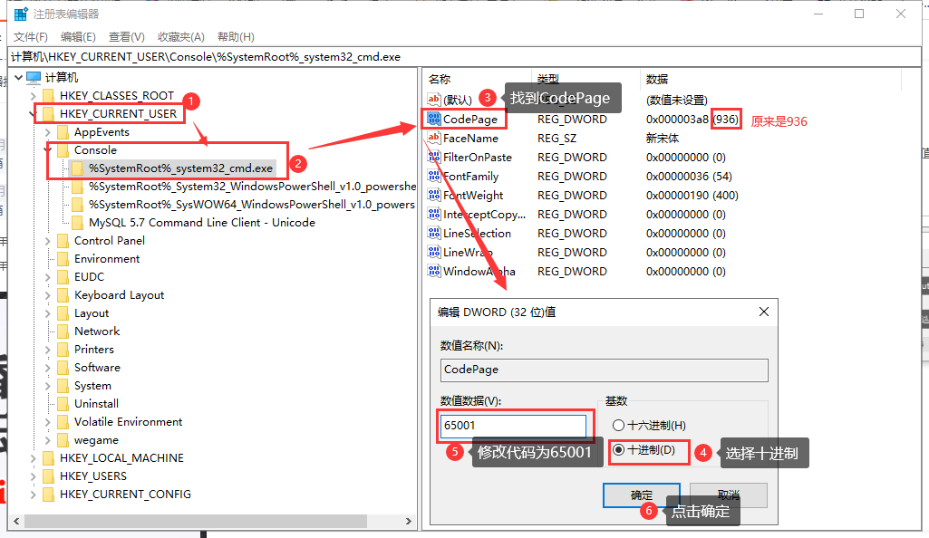 2.按照如下步骤修改代码页编码为65001,注意选择十进制!