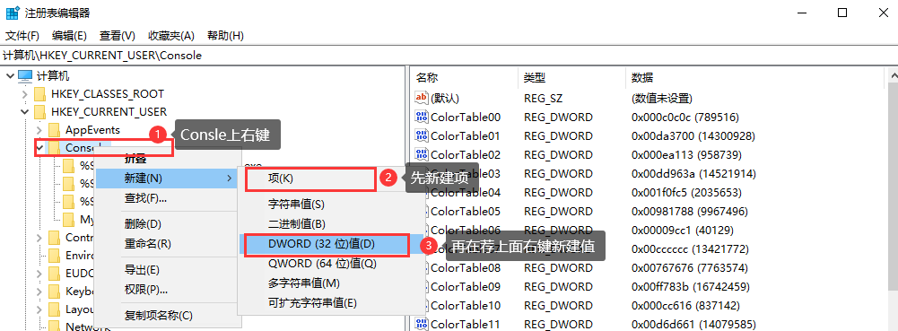 1、在注册表HKEY_CURRENT_USER\Console下新建SystemRoot%_system32_cmd.exe项