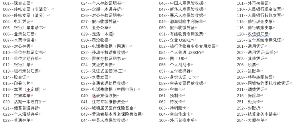 凭证类型:现金支票、转账支票、银行汇票、存单、银行本票、存折卡凭证号、印鉴卡、借记卡凭证号、信用证等。