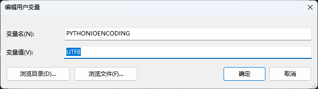 输入变量名称“PYTHONIOENCODING”(如果问题不仅限于Python,则可能需要考虑其他变量名称),并在变量值中输入“UTF-8”(注意大小写)。