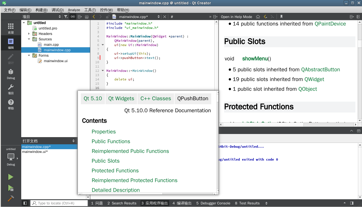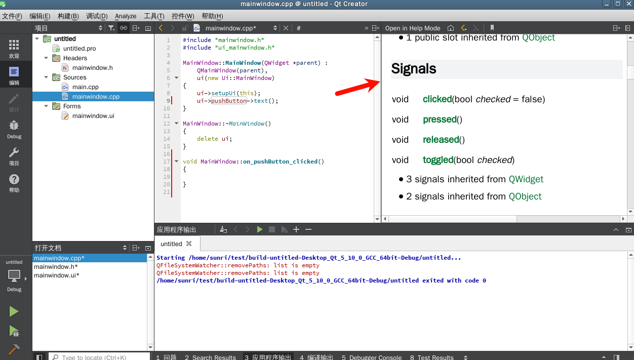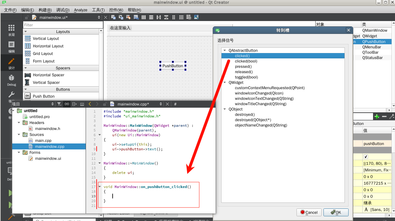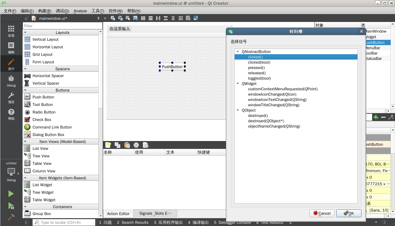 在ui组件上,右键转到槽,选择信号后,自动创建槽函数,并且自动与组件的信号进行关联。只需要实现槽函数即可。