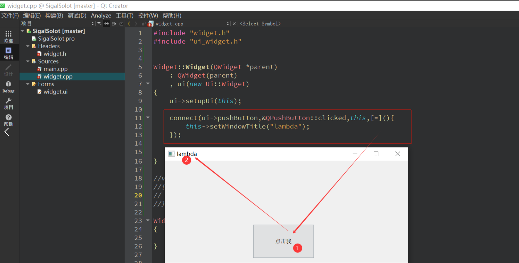 在Qt中,Lambda表达式通常用于连接信号和槽,如下所示: