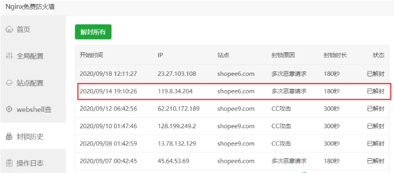 2、查看封锁历史,有没有自己的本地IP,当时自己的电脑本地公网IP是:113.16.60.221。果然在里面