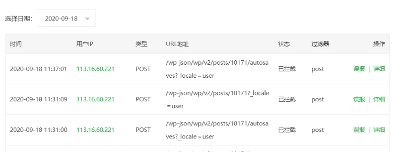 其中提示“/wp-json/wp/v2/posts/10171/autosaves?_locale=user”,过滤器是post,说明在编辑文章的时候,因为文章里面包含一段代码,这些代码刚好触动了防火墙的过滤器,默认认为是恶意请求。导致将该IP封锁,只要将本地IP设置为白名单即可。