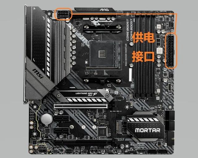 主板也得吃饭(供电)。所以主板顶部有个8pin(指8个针脚)的cpu供电接口,主板右侧边上有个24pin的主板供电接口: