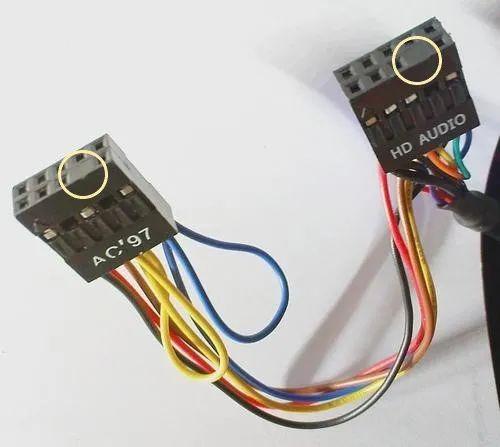 可以发现:音频接口和音频线都对应少根针、少个孔,这就是防呆设计,如果你插错插反,那么是接不上去的(除非大力出奇迹)。主板接口有很多类似的防呆设计,如cpu、内存等